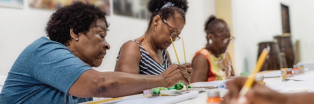 Arte: La instructora de arte, la Sra. Geraldine Davis, ofrece a los adultos mayores actividades artísticas altamente creativas que traen una sensación de alegría, calman sus mentes y reducen el estrés.